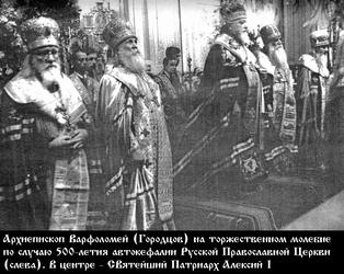 Архиепископ Варфоломей (Городцев) на торжественном молебне по случаю 500-летия автокефалии Русской Православной Церкви (слева). В центре Святейший Патриарх Алексий I