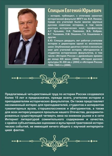 Эти обстоятельства подвигли историка к тому, чтобы за собственный счет ограниченным тиражом издать свой четырехтомник и показать, что есть реальная альтернатива линейке учебников по истории. "Полный курс истории России", состоящий из четырех книг, охватывает важнейшие периоды российской истории: "Древняя и Средневековая Русь IX-XVII вв.", "Российская империя XVIII – начала XX вв.", "Россия – Советский Союз 1917-1945 гг." и "Россия – Советский Союз 1946-1991 гг.". "Проблема единых учебников снимается в моем учебнике через историографию. Я не навязываю собственную точку зрения и точку зрения определенной группы авторов, а даю различные точки зрения на ключевые события и персонажей. От того, кого мы воспитаем, будет зависеть развитие страны на ближайшие 50-60 лет. И если мы воспитаем Иванов, не помнящих родства, и зомбированных манкуртов, то, я думаю, исторически Россия будет обречена и на прозябание, на распад и разложение", - считает историк Спицын.