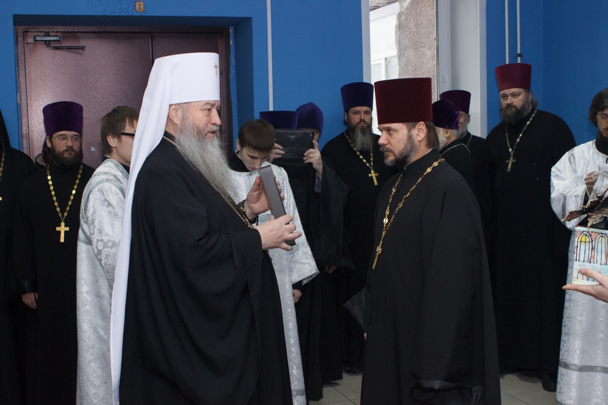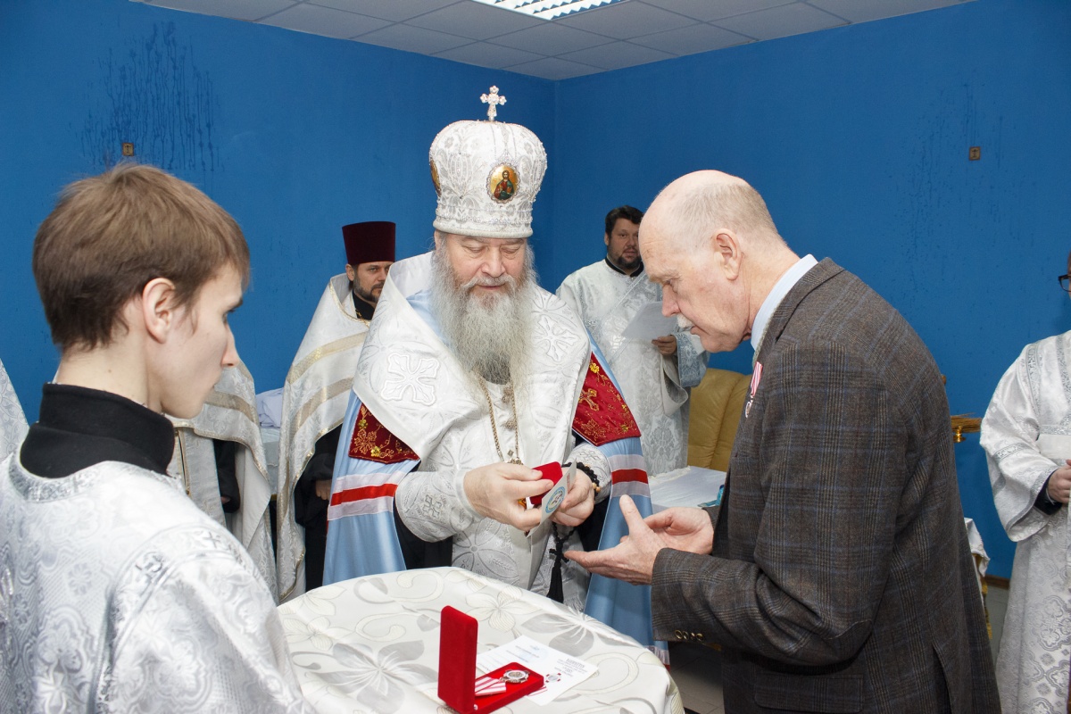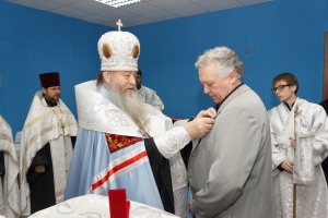 Владыка Тихон освятил общежительный корпус и после молитвы тепло поздравил учащихся с улучшением быта, благословив их на доброе дело. Он также особо поблагодарил всех, кто потрудился на строительстве. По случаю освящения нового общежительного корпуса и в честь тысячелетия преставления святого князя Владимира правящий Архиерей наградил архитектора Николая Николаевича Деева и прораба строительства Геннадия Александровича Фролова памятными медалями «1000-летие преставления святого равноапостольного князя Владимира».