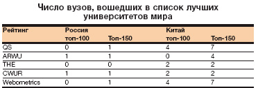 университетов согласно мировым рейтингам.На данную программу было запланировано выделение 54 млрд руб. из федерального бюджета. За три года – с 2013 по 2015 год – на проект «5–100» правительством РФ уже было выделено почти 30 млрд руб. Пройдена половина пути в четыре года до означенного пункта назначения – 2020 года. Каковы же промежуточные результаты? Общественное движение «Обрнадзор» уже дало свою оценку данному проекту: средняя стоимость роста российского вуза на 1 пункт в британском рейтинге QS обходится российским налогоплательщикам в 72 млн руб.! Однако попытаемся бросить более общий взгляд на ситуацию, сравнив достижения России в данной области с достижениями Китая. Для этого сравним число вузов России и Китая, вошедших в 2015 году в списки топ-100 и топ-150 по пяти самым известным глобальным рейтингам университетов (см. таблицу). Данные в таблице во многом обескураживают. К сожалению, кроме МГУ им. М.В. Ломоносова (кстати, не вошедшего в программу «5–100»), больше ни один российский вуз не смог преодолеть границу даже топ-150. На этом фоне китайские успехи смотрятся не только более значительными, но и более полновесными. Например, в рейтинге QS лучший китайский вуз не просто вошел в топ-100, но оказался на 25-м месте, что исключает случайный успех. Еще три китайских университета получили 41-е, 51-е и 70-е места; плюс к этому три «догоняющих» вуза расположились на 110-й, 113-й и 130-й позициях. В другом авторитетном британском рейтинге, THE, два китайских университета закрепились на 42-м и 47-м местах. Результат, очень похожий на результат QS, был получен и в испанском рейтинге Webometrics: четыре лучших вуза Китая разместились на 37-м, 48-м, 57-м и 70-м местах; «догоняющие» вузы из Поднебесной захватили 111-е, 133-е и 137-е места. Достижения КНР в аравийском рейтинге CWUR похожи на достижения в рейтинге THE: 56-е и 78-е места в первой сотне. Фактически Китай уже достаточно прочно закрепился среди стран – лидеров высшего образования, тогда как Россия выглядит случайным субъектом на рынке глобальных университетов – если бы не МГУ, то страна вообще была бы за пределами конкуренции университетов мирового класса. Мы видим здесь разные стратегии двух стран: Россия – громкие заявления, федеральная поддержка, большие деньги и… слабый результат; Китай – молчаливая, спокойная работа без амбициозных заявлений и примитивной рекламы и… очень приличный результат. Хотелось бы обратить внимание еще на одно важное обстоятельство, которое видно из приведенной таблицы. Из всех пяти рейтингов в первой сотне Россия смотрится лучше Китая только в одном – в ARWU, который с 2003 года составляется самими китайцами – Шанхайским университетом Shanghai Jiao Tong University. То есть китайцы скромно отдают первенство российскому МГУ перед всеми своими вузами, ставя их только во вторую сотню. Тем самым китайские ренкеры отнюдь не склонны завышать позиции своих университетов, тогда как их высокие места подтверждаются именно зарубежными аналитиками. Россия, наоборот, всячески хочет опротестовать «чужие» рейтинги. Для этого в 2009 году независимым агентством «РейтОР» при консультационной поддержке МГУ был разработан российский рейтинг ведущих университетов мира «Global Universities Ranking» (GUR), в котором МГУ занял 5-е место, оттеснив Гарвардский университет на 6-е место. К сожалению, совместных сил и ресурсов МГУ и компании «РейтОР» хвати