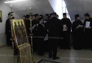 Посвящен праздник был покровителям образования – святителям Василию Великому, Григорию Богослову и Иоанну Златоусту. В честь этого события в «Афониаде» состоялось торжественное богослужение, в котором приняли участие протэпистат Священной Эпистасии о. Павел Лавриот, игумен монастыря Григориат архимандрит Христофор, дикей Андреевского скита архимандрит Ефрем, куратор школы иеромонах Георгий, преподаватели о. Иероним (Ксандопулос) и о. Константин (Фундуклидис), настоятель школьного храма иеромонах Артемий (Кареотис), а также члены Священной Эпистасии Афона.