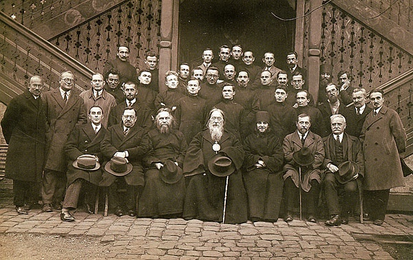 Преподаватели и студенты Свято-Сергиевского богословского института. 1931 г. Сидят (слева направо): Б.П. Вышеславцев, В.В. Зеньковский, протоиерей Сергия Булгаков, митрополит Евлогий (Георгиевский), иеромонах Иоанн (Шаховской), А.В. Карташев, Е.М. Киселевский. Стоят (слева): Л.А. Зандер, В.Н. Ильин, Б.И. Совэ, С.С. Безобразов. Стоят (справа налево): Г.П. Федотов, М.М. Осоргин, Г.В. Флоровский