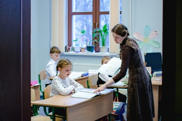 Диалог учителя и ученика происходит непрерывноУтро в гимназии начинается с общей молитвы. Церковнославянский язык начинают преподавать со второго класса, так что дети сами читают утреннее правило. Каждый урок начинается и заканчивается молитвой.
