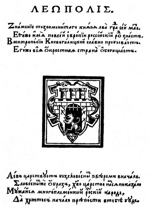 Илл. 1. Аделфотис. Титульный лист. На обороте титула помещён герб Львова и геральдический стих «Леополис» со словами: по всей Европии российский род знает; далее неизвестный поэт обращается к читателям: Мужайся многоплеменный росский народе… (илл. 2).