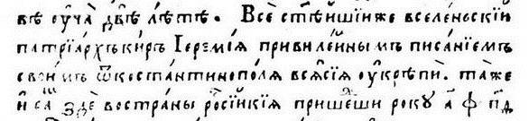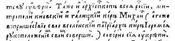 Илл. 4. Аделфотис. Предисловие. Фрагмент. Далее предисловие сообщает, что архиепископ всея России митрополит Михаил Рогоза соборно подтвердил грамоту патр. Иеремии: Та же и архиепископ всея России, митрополит Киевский и Галицкий кир Михаил … соборне сея укрепи и пришествием своим, посетивше зде року 1591…(илл. 5).