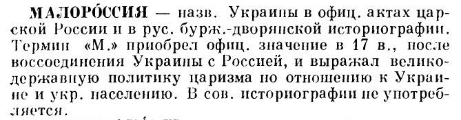 «Советская историческая энциклопедия», гл. ред. Е.М. Жуков: «МАЛОРОССИЯ – назв. Украины в офиц. актах царской России и в рус. бурж.-дворянской историографии. Термин «М.» приобрел офиц. значение в 17 в., после воссоединения Украины с Россией, и выражал великодержавную политику царизма по отношению к Украине и укр. населению» (илл. 3) [2].