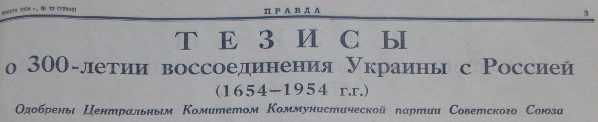 Но именно относительно поздний термин «воссоединение Украины с Россией» наиболее широко обосновался в массовом сознании; для этого КПСС использовала мощь своей пропагандистской машины. В качестве повода послужила 300-летняя годовщина знаменитой Переяславской рады. Весьма примечательны в этом отношении миллионотиражные выпуски центральных советских газет 1954 года, посвящённые празднованию «300-летия воссоединения Украины с Россией». Главная газета СССР, «Правда», 12 января опубликовала предельно идеологизированные «Тезисы о 300-летии воссоединения Украины с Россией (1654-1954 гг.)» (илл. 1). илл. 1 Множество воспроизводящих подобные названия материалов газеты растиражировали в мае того же года, когда в Москве и Киеве прошли организованные компартией «всенародные торжества». В том же году эти тезисы и производные историко-идеологические тексты были продублированы огромной волной пропагандистских брошюр, «300 лет воссоединения Украины с Россией» шло в народ воплощённым в гранит монументальных памятников, изображённым на миллионах юбилейных плакатов (илл. 2), декоративных изделий, на сувенирах, значках, почтовых открытках, марках (набрав этот слоган в поисковик «Яндекса» можно увидеть массу антикварных предметов такого рода). «Воссоединение Украины с Россией» на десятилетия стало общим местом учебников истории. Так, под лозунгом «братской дружбы русского и украинского народов», в сознание русских людей внедрялся пропагандистский штамп, что Украина к 1654 г. была не-Россией, что «Украину и Россию» населяли и населяют, пусть и «братские», но разные народы. илл. 2