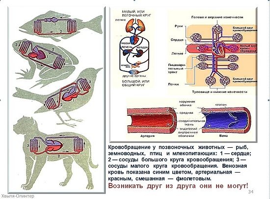 Кровобращение у позвоночных животных – рыб, земноводных, птиц и млекопитающих: 1 – сердце; 2 – сосуды большого круга кровообращения; 3 – сосуды малого круга кровообращения. Венозная кровь показана синим цветом, артериальная – красным, смешанная – фиолетовым. Возникать друг из друга из-за качественных различий они не могут!