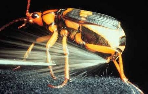 Жук-бомбардир защищает себя от хищников с помощью сильной струи кипящей жидкости, выпрыскиваемой под высоким давлением во время быстрого действия под названием пульсивное возгорание. Температура жидкости – около 100° Цельсия! Выброс происходит импульсивно с частотой до 500 выстрелов в секунду. Брюшной кончик жука действует в роли вращающейся орудийной установки, которая позволяет жуку направлять поток жидкости в любом направлении… Постепенная «эволюция» и здесь невозможна!