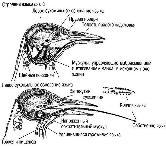 Язык дятла имеет на конце колючки и каплю клея. Так он подбирает насекомых, которые прячутся в ходах внутри дерева. Окружая голову и шею под кожицей сзади, язык растягивается до 15 см дополнительно. Он длинный, но вместо того, чтобы свисать, находится в муфте под свободной кожицей позади шеи. Там косточки языка разделяются на две ветви и снова соединяются вместе перед входом в клюв. Дятел направляет свой язык точно туда, где прячется насекомое. Насекомое надежно захватывается сложными устройствами на конце языка и втягивается в клюв. Хитроумный язык, с устройствами на конце, пять тонких гибких косточек с суставами. Что укоренило их в правой ноздре, окружило голову и шею сзади и вернуло в углубление между двумя половинками клюва? Никакие промежуточные состояния здесь невозможны. В качестве научного эксперимента попробуйте позавтракать, непрерывно высовывая свой язык в сторону изо рта.