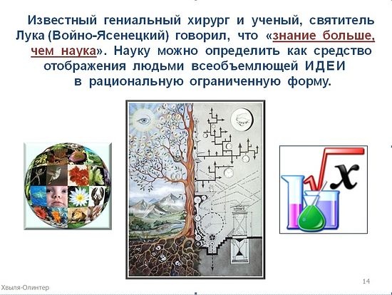 Известный гениальный хирург и ученый святитель Лука (Войно-Ясенецкий) говорил, что «знание больше, чем наука». Науку можно определить как средство отображения людьми всеобъемлющей ИДЕИ в рациональную ограниченную форму. Возникает необходимость различение истинной ИДЕИ и ложных идей, то есть единственной науки и сонма лженаук. И опять существенно, какая выбрана духовность.