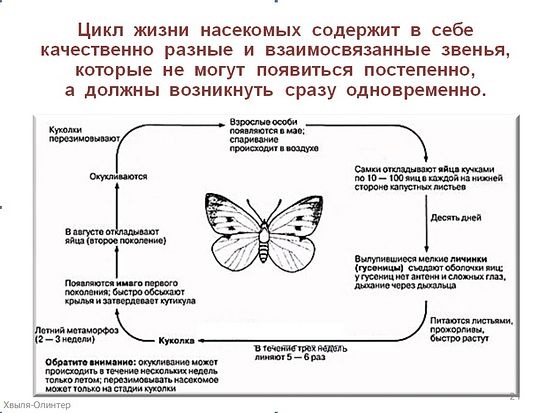 Цикл жизни насекомых содержит в себе качественно разные и взаимосвязанные звенья, которые не могут появиться постепенно, а должны возникнуть сразу одновременно.