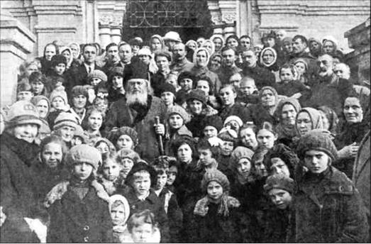 Епископ Лука среди своей паствы. 1920-е гг. Позже архиерея вернули в Красноярск, он находился в дороге полтора месяца. На обратном пути его встречали колокольным звоном. Попутно профессор оперировал мальчика с запущенным остеомиелитом бедра, а также убеждался, встречаясь с оперированными им прежде больными, что выздоровление всех было полным. В Красноярске он отслужил рождественскую литургию, сделал неотложные глазные операции и через Черкассы вернулся в Ташкент в январе 1926 года. Митрополит Сергий (Страгородский) хотел перевести епископа Луку в Рыльск, потом в Елец, затем в Ижевск. Живший тогда в Ташкенте митрополит Арсений (Стадницкий) посоветовал никуда не ехать, а подать прошение об увольнении на покой. Прошение было подписано, и с 1927 года профессор-епископ, лишенный двух кафедр - церковной и университетской - проживал в Ташкенте как частное лицо. По воскресеньям и праздникам он служил в церкви, а на дому принимал больных, число которых достигало четырехсот в месяц. Как и прежде, прием пациентов был бесплатным. Владыка был настроен категорически против политики закрытия и тем более уничтожения храмов, накал страстей дошел до того, что он даже грозил властям сжечь себя на костре из икон после последней разрешенной службы в Сергиевском храме. Но все кончилось необоснованным арестом в 1930 году. В тюрьме Владыка объявил голодовку и довел ее до того, что у него появилась кровавая рвота. Затем последовал ссыльный этап: Самара-Москва-Котлас-Архангельск. Профессор оперировал в котласской больнице, в этом городе и в Архангельске было множество детей с заразными заболеваниями. Он сделал также операцию женщине по поводу рака груди. Владыке приходилось скитаться по городам и весям. Ссылка окончилась в 1933 году, и он попеременно жил то в Москве, то в Ташкенте и Архангельске, временно проживал в Феодосии. Одно время он пребывал в Сталинабаде, где провел ряд успешных операций, и был приглашен там на работу, но заявил, что останется только в том случае, если в городе будет сооружен православный храм. На это власти не пошли... Временами Владыке приходила мысль о раскаянии в том, что архиерею недопустимо работать в моргах и бараках гнойных отделений, но на одной из молитв неземной голос надоумил хирурга в этом не каяться... В годы «ежовщины» последовал третий арест Владыки в 1937 г., голодовка, издевательства... К тому времени у профессора развились склероз аорты, расширение сердца и другие тяжелые заболевания, но это не спасло его от тюремных мучений. После побоев и допросов Владыку направили в третью ссылку по маршруту: Алма-Ата-Новосибирск-Томск-Красноярск-Большая Мурта. В этой захолустной деревне профессор развил медицинскую деятельность. Еще из Ташкента он написал маршалу К.Е. Ворошилову о том, что ему нет возможности закончить книгу по гнойной хирургии, которую он считает очень актуальной не только в мирное время, но и на случай войны, и вдруг хирургу было разрешено работать в библиотеке в Томске. Так была закончена эта многострадальная, главная книга всей жизни. Сначала Отечественной войны Владыку по требованию М.И. Калинина перевели в Красноярск и назначили главным хирургом эвакогоспиталя. (Перед этим хирург написал М.И. Калинину, что является специалистом по гнойной хирургии, попросил прервать ссылку, предложил свои услуги и подписался в тел