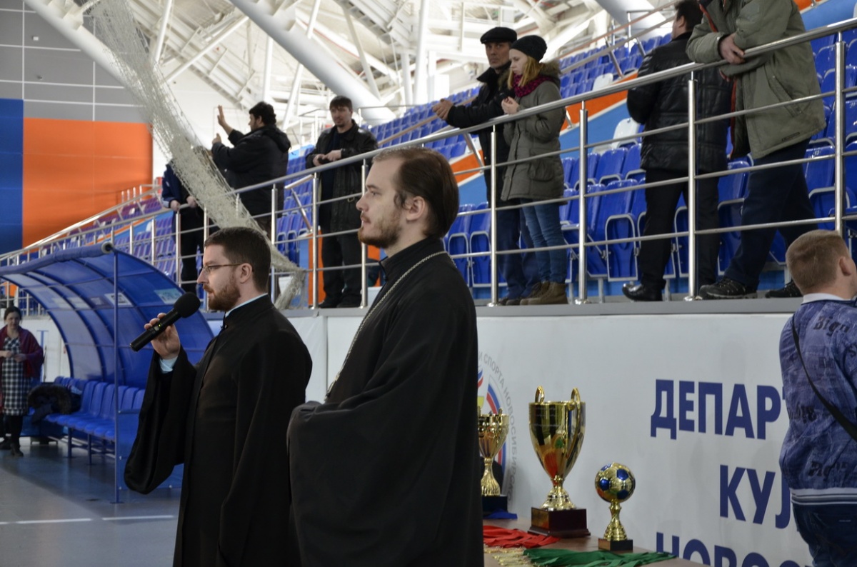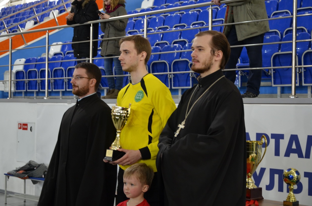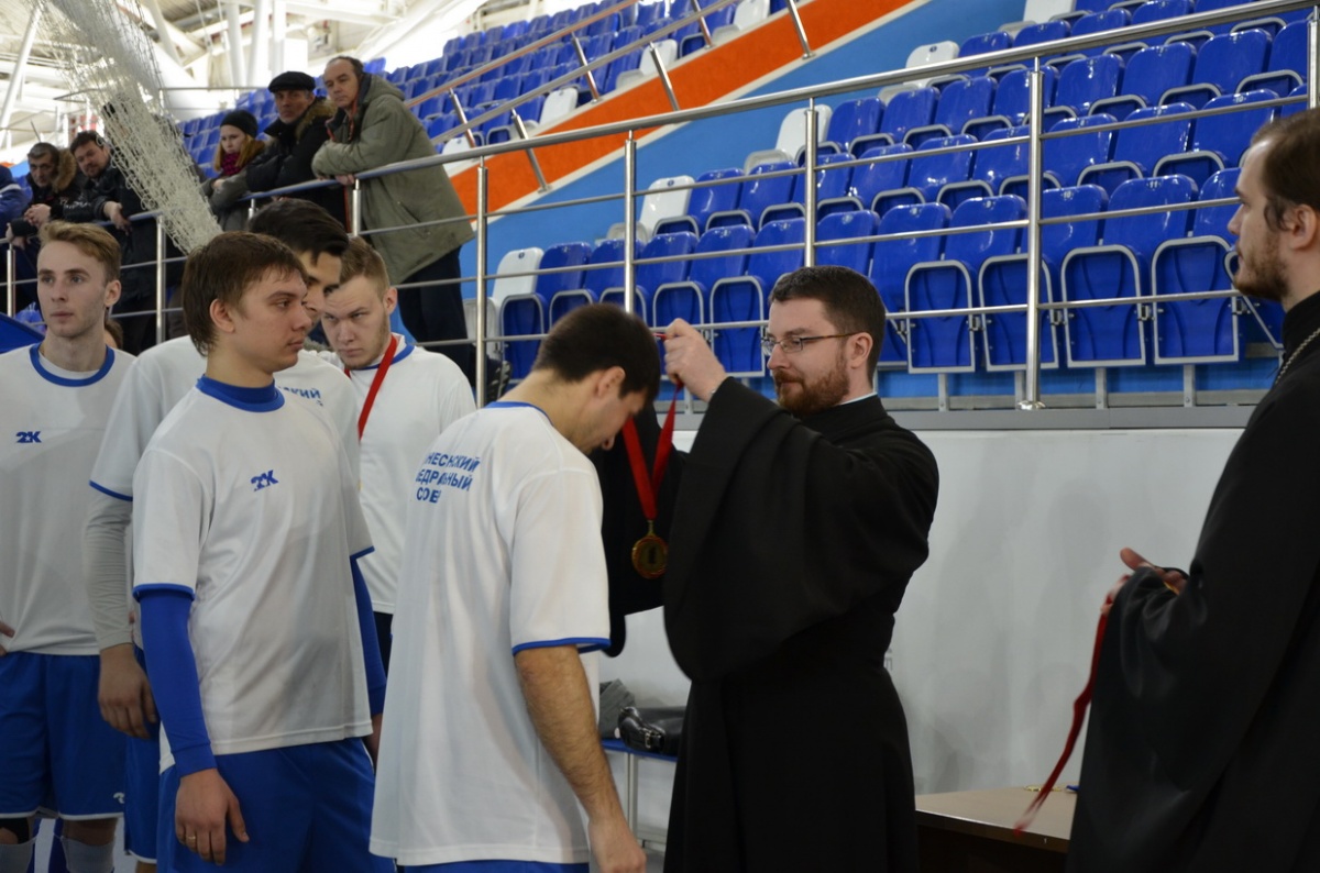 Состоялся VI Межприходской турнир по футболу на кубок Александра НевскогоВ соревнованиях приняли участие шесть команд: Вознесенского собора, Александро-Невского собора, Успенского (Затулнский ж/м), Знаменского храмов, храма во имя мученика Вонифатия и Новосибирской Православной духовной семинарии. Участники турнира - православные верующие, прихожане новосибирских храмов. Участников команд приветствовал руководитель Епархиального отдела по спорту диакон Борис Левитан. Он напомнил, что турнир проходит в дни Великого поста, поэтому необходимо быть внимательнее друг к другу, корректными, вежливыми - не только в поступках, но и в словах. "У нашего турнира две цели: спортивная - мы собираемся, чтобы показать свою спортивную форму, те результаты, к которым пришли в процессе тренировок. Но главная цель - чтобы мы все были едины. Не случайно турнир проходит в честь великого князя и воина, святого Александра Невского. Так же как он мы всегда должны быть готовы встать на защиту своей Православной веры".