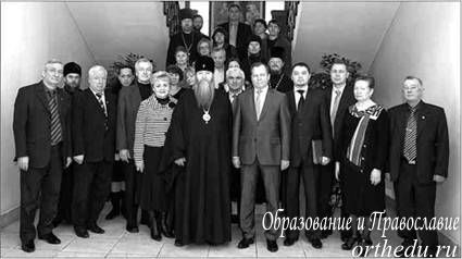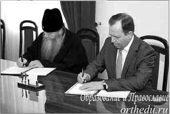 Управляющий Новосибирской Епархией Русской Православной Церкви Архиепископ Новосибирский и Бердский Тихон. Заместитель председателя Правительства Новосибирской области – министр образования, науки и инновационной политики В.А. Никонов. Статья 1 Предметом настоящего Соглашения является сотрудничество Сторон в области образования, духовно-нравственного просвещения обучающихся, развития системы образования в Новосибирской области. Указанное сотрудничество включает: – сотрудничество в решении вопросов обеспечения прав граждан на свободное и добровольное приобщение их детей к ценностям и традициям православной культуры в государственных и муниципальных общеобразовательных учреждениях с учетом законных интересов и прав представителей других религиозных организаций и нерелигиозной части общества; – сотрудничество при разработке и реализации ведомственных и областных целевых программ по духовно-нравственному, патриотическому, гражданскому воспитанию и просвещению детей и молодёжи; – сотрудничество в решении организационных вопросов, связанных с преподаванием предметов по православной культуре в государственных и муниципальных общеобразовательных учреждениях, развитием их учебно-методического обеспечения и научно-педагогической базы, подготовкой, повышением квалификации и получением рекомендаций педагогами, желающими преподавать данные предметы; – сотрудничество в проведении экспертизы содержания учебников и образовательных материалов, предназначенных для преподавания предметов по православной культуре в государственных и муниципальных общеобразовательных учреждениях; – сотрудничество в организации деятельности негосударственных общеобразовательных учреждений, учрежденных Стороной соглашения или действующих при ее участии, их интеграции в систему образования Новосибирской области, развитии взаимодействия с государственными и муниципальными общеобразовательными учреждениями в проведении просветительской работы по вопросам обучения, гражданского, патриотического, духовно-нравственного воспитания обучающихся; – сотрудничество в проведении научно-практических и просветительских конкурсов, конференций и других мероприятий для обучающихся и педагогических работников, в том числе на базе религиозных организаций Русской Православной Церкви в Новосибирской области (монастырей, духовных образовательных учреждений и др.); – сотрудничество в недопущении внедрения деструктивных религиозных и экстремистских организаций в образовательные учреждения, в ученические и студенческие сообщества; – содействие сотрудничеству образовательных учреждений профессионального религиозного образования, расположенных на территории Новосибирской области, с государственными и муниципальными образовательными учреждениями разных типов и видов по вопросам научно-образовательной деятельности, возрождения отечественных традиций духовно-нравственного образования и воспитания, подготовки педагогических кадров; – анализ и обобщение опыта совместной работы в области образования, духовно-нравственного просвещения обучающихся, размещение информации о сотрудничестве в средствах массовой информации; – объединение усилий в пропаганде здорового образа жизни, укреплении семьи, улучшении демо